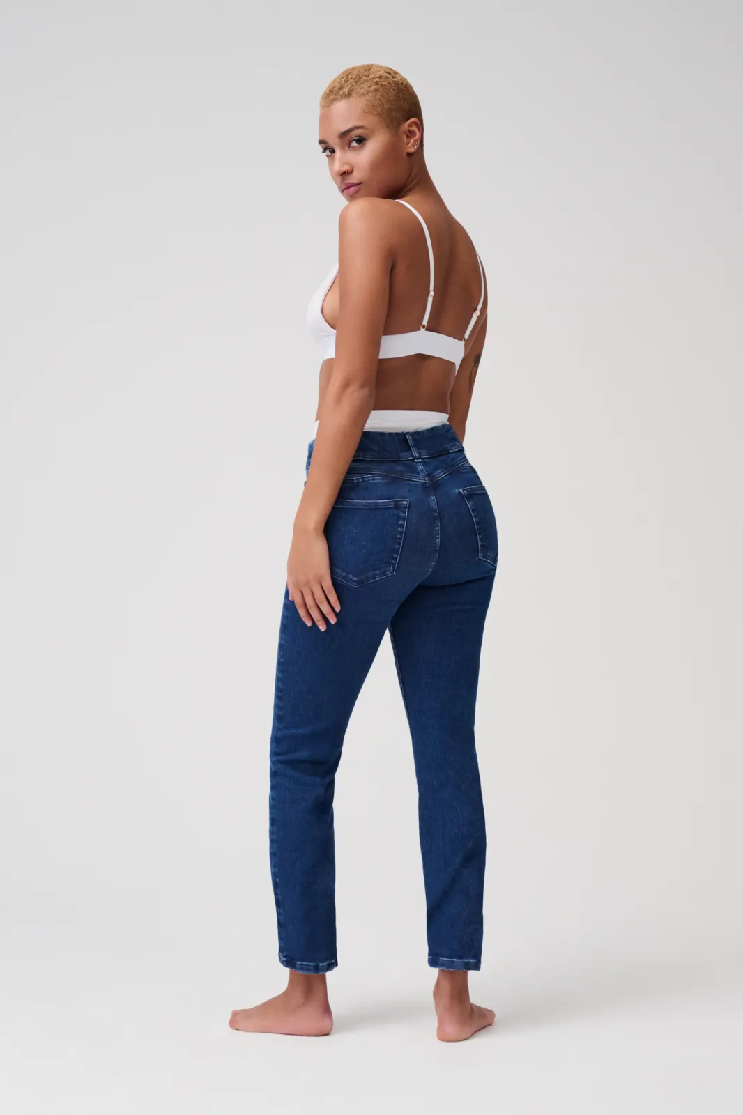 The slim high rise denim sits perfectly at the waist thanks to patented shape technology. The elaborately designed yoke and extra-wide waistband with smocked elastic inserts wrap around the body like a hug.